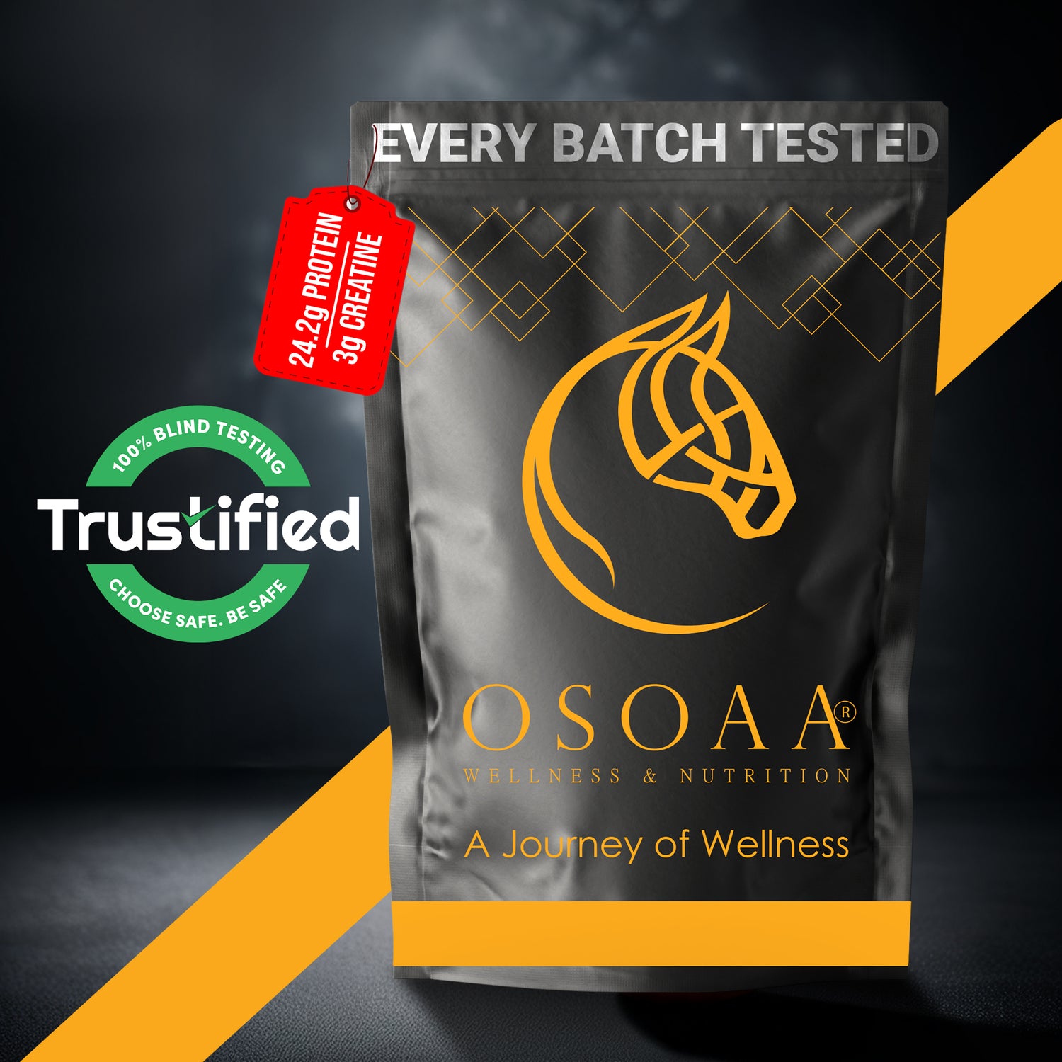 OSOAA is the only brand that provides 100% Batchwise Lab Test Reports, ensuring transparency and safety. Our protein is rigorously tested by NABL accredited lab for Protein content, Aflatoxins, Heavy Metals, and Pesticides. Simply scan the QR code on the label to access these reports. We guarantee 100% money back if the protein content falls short of our label claims.