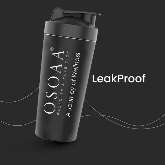 Osoaa Metal Shaker 700 ml with Steel Whisk, Leakproof Gym Shaker Bottle, Black